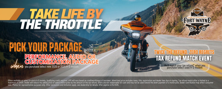 Offers available on select in-stock H-D models. Qualifying credit required. APR will vary based on creditworthiness of borrower. Advertised price excludes taxes, title, registration and dealer fees due at signing. Tax refund match offer is limited to a maximum of $1500. Dealer will reduce the selling price of select motorcycles by the amount of tax refund. Offers are not redeemable for cash and may not be used toward the down payment of a motorcycle. Dealer contribution may affect consumer cost. Photos for representative purposes only. Other exclusions and limitation apply, see dealership for details. Offer expires 4/25/26.